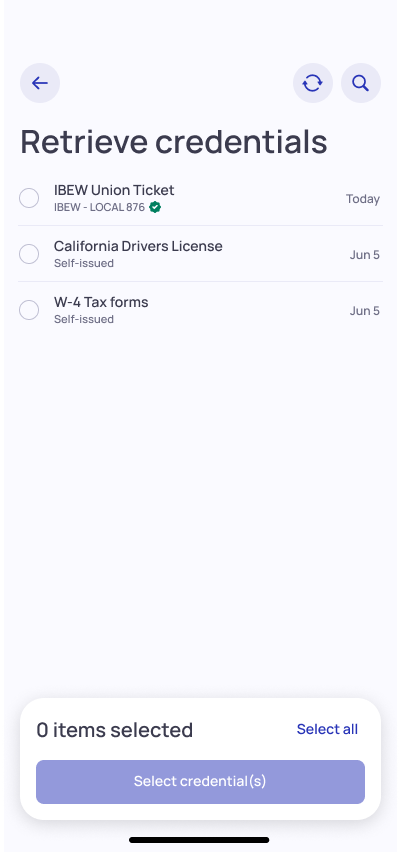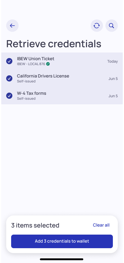 2. Select credentials you’d like to retrieve and tap “Add credentials to wallet”. Tapping the credential title allows you to view it’s details.
