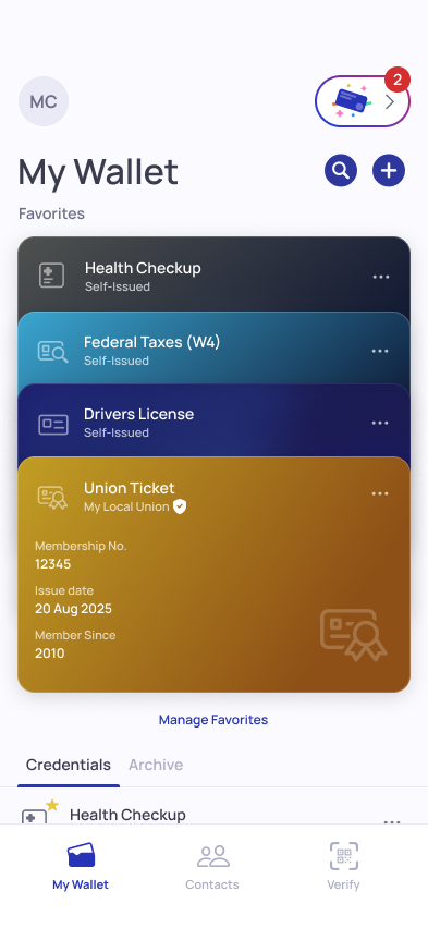 1. From the My Wallet tab, tap the card icon in the top right of the screen. There should be a red badge indicating how many new credentials you have waiting for you.