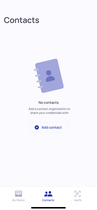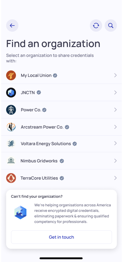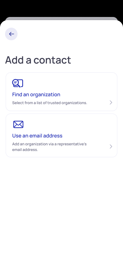 3. To add a contact, browse a list of trusted organizations by selecting “Find an Organization” or select “Use an email address” to add a contact using their email address or JNCTN QR code